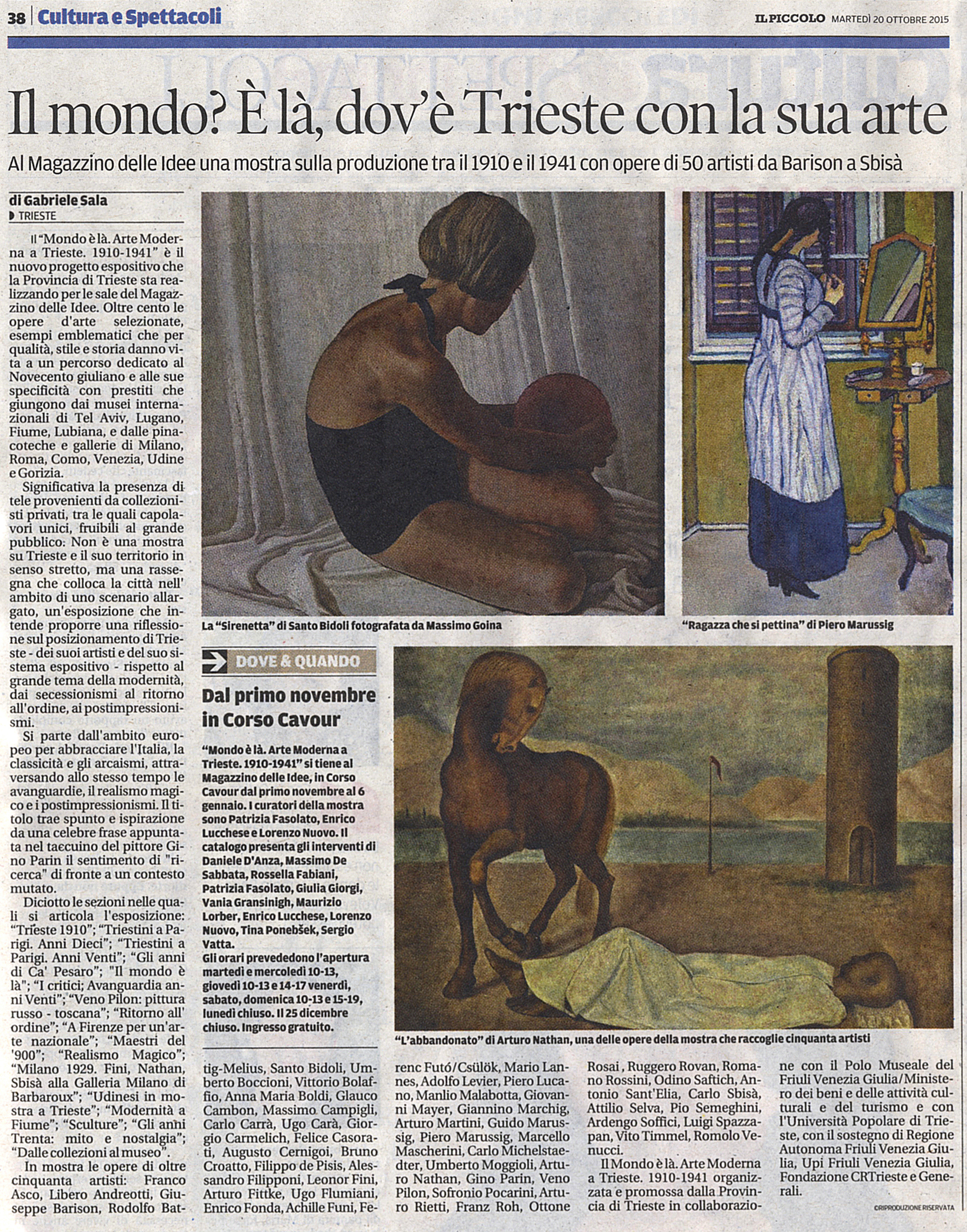 IL PICCOLO, 20 ottobre 2015. Articolo con mia immagine delll’opera di Santo Bidoli “La sirenetta” (patrimonio artistico del Gruppo Generali), esposto alla mostra “Il Mondo è là. Arte moderna a Trieste. 1910-1941”, organizzata dalla Provincia di Trieste al Magazzino delle Idee. La foto de “La sirenetta” è stata anche pubblicata nel catalogo dedicato alla mostra.