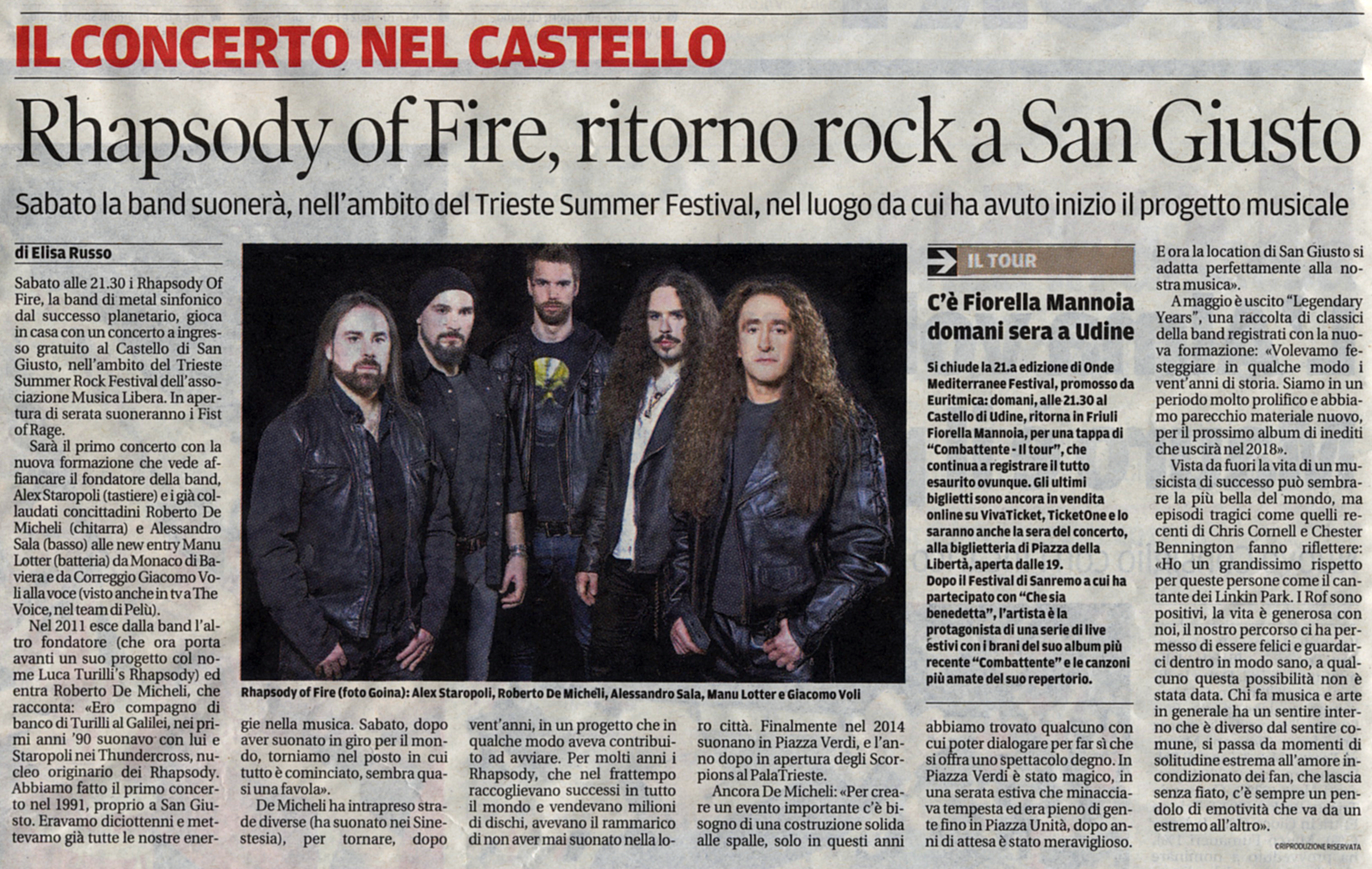 IL PICCOLO, 16 luglio 2017, articolo con mia foto dei Rhapsody of Fire, che presentano al castello di San Giusto, a Trieste, la nuova line up e il nuovo CD appena uscito in anteprima mondiale. La foto è stata utilizzata anche all’interno del CD.