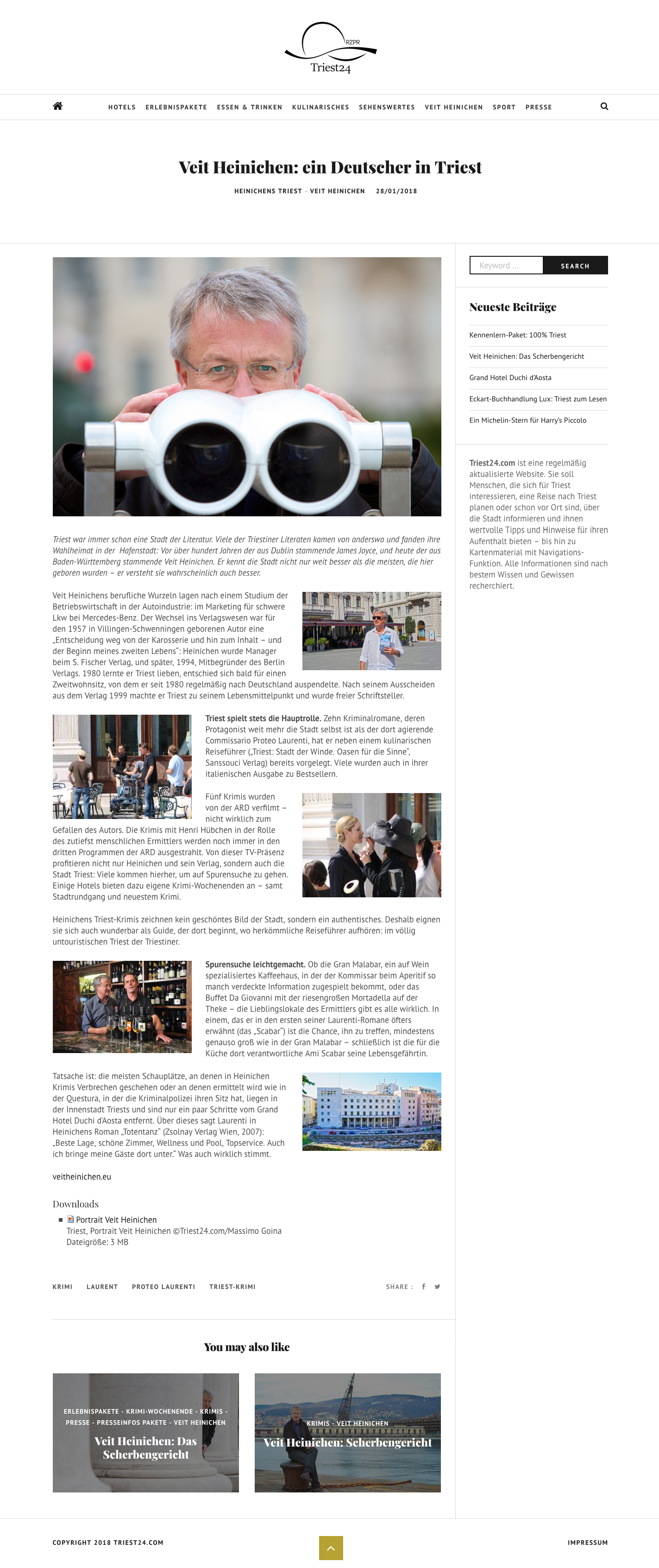 TRIEST24.COM, 28 gennaio 2018. Articolo su Veit Heinichen, con miei ritratti del famoso romanziere tedesco.